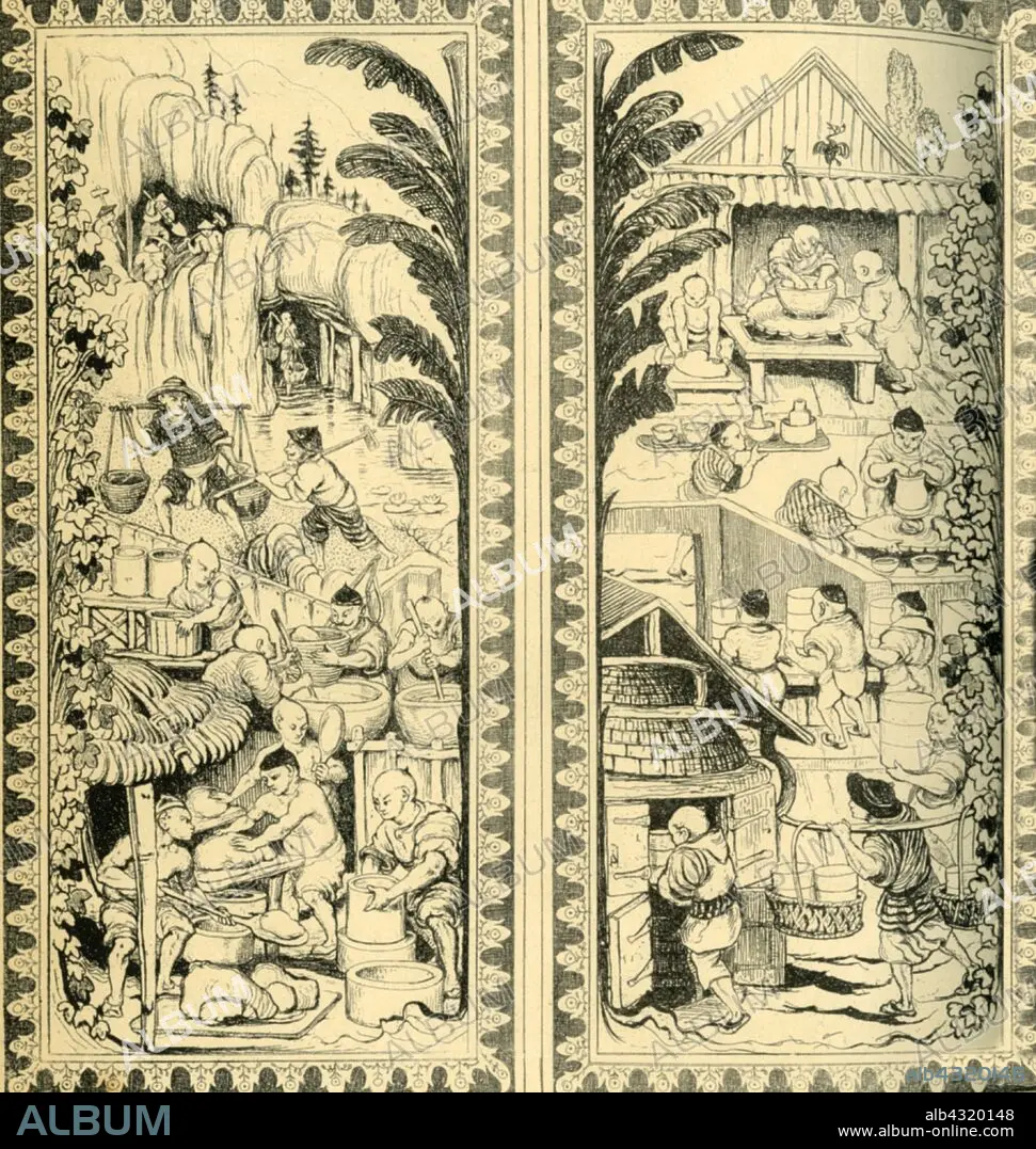 Caption: Chinese potters at work, design for stained glass window, c1870, (1881). 'Two Panels of Windows in the Gallery of the Museum Containing Pottery' in the South Kensington Museum, by William Bell Scott. One of fourteen stained-glass windows in the Ceramic Gallery, depicting Scott's idea of ceramic manufacture in China: carrying the clay in yokes, mixing glazes, kneading, throwing on a wheel, loading pottery into a kiln. From "The South Kensington Museum", a book of engraved illustrations, with descriptions, of the works of art in the collection of the Victoria & Albert Museum in London (formerly known as the South Kensington Museum). [Sampson Low, Marston, Searle and Rivington, London, 1881]