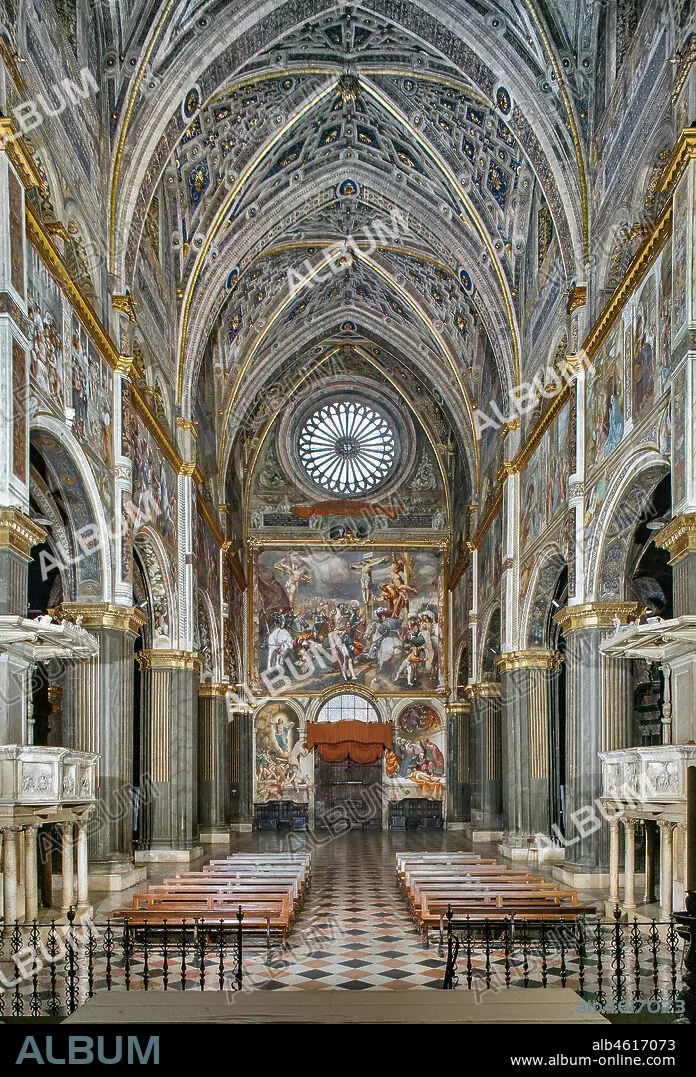Caption: Cremona, Duomo ((the Cathedral of Santa Maria Assunta), interior: view of the nave and the counterfaçade with the "Crucifixion", fresco by Pordenone (Giovanni Antonio de' Sacchis), 1521.
