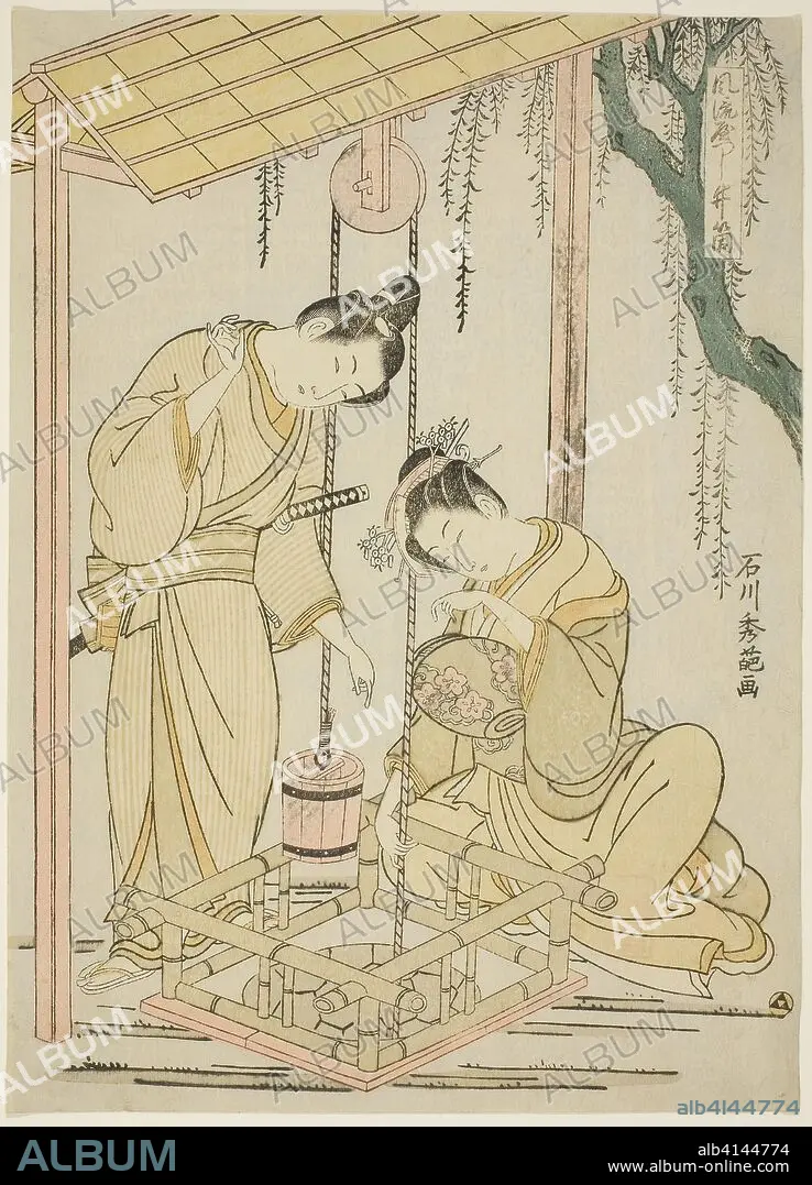Caption: Modern parody of the well-curb episode from "Tales of Ise". Ishikawa Toyonobu; Japanese, 1711-1785. Date: 1761-1771. Dimensions: 24.0 x 17.4 cm (9 1/2 x 6 7/8 in.). Color woodblock print; koban, benizuri-e. Origin: Japan.