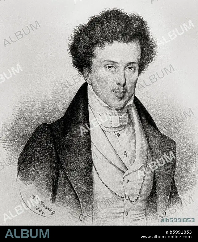 Caption: Dumas, Alexandre (Dumas père); French. Writer; Villers-Cotterets 24.7.1802 - Puys at Dieppe 5.12.1870. Portrait. Chalk lithograph after drawing, 1832, by Antoine Maurin (1793-1860). Paris, Bibliothèque Nationale.