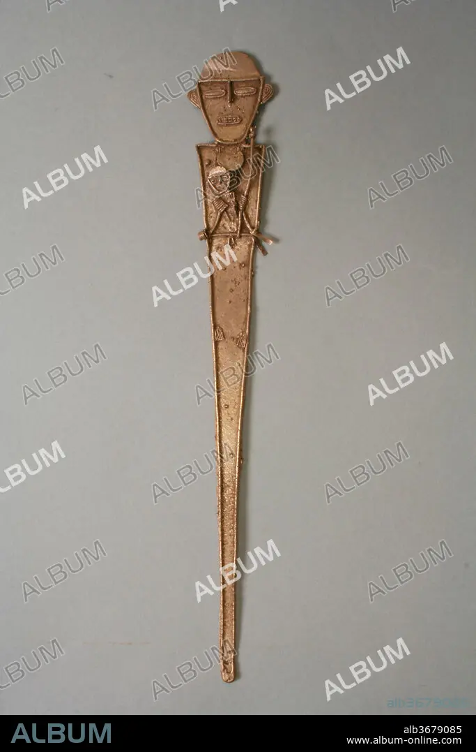 Caption: Female Figure (tunjo). Culture: Muisca. Dimensions: H. 7 3/4 x W. 1 1/8 x D. 1/8 in. (19.7 x 2.8 x 0.3cm). Date: 10th-16th century.