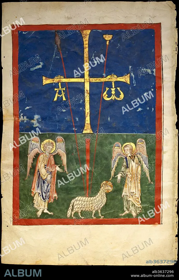 Caption: Leaf from a Beatus Manuscript: the Lamb at the Foot of the Cross, Flanked by Two Angels; The Calling of Saint John with the Enthroned Christ flanked by Angels and a Man Holding a Book. Culture: Spanish. Dimensions: Overall (folio): 17 1/2 x 11 13/16in. (44.4 x 30cm)