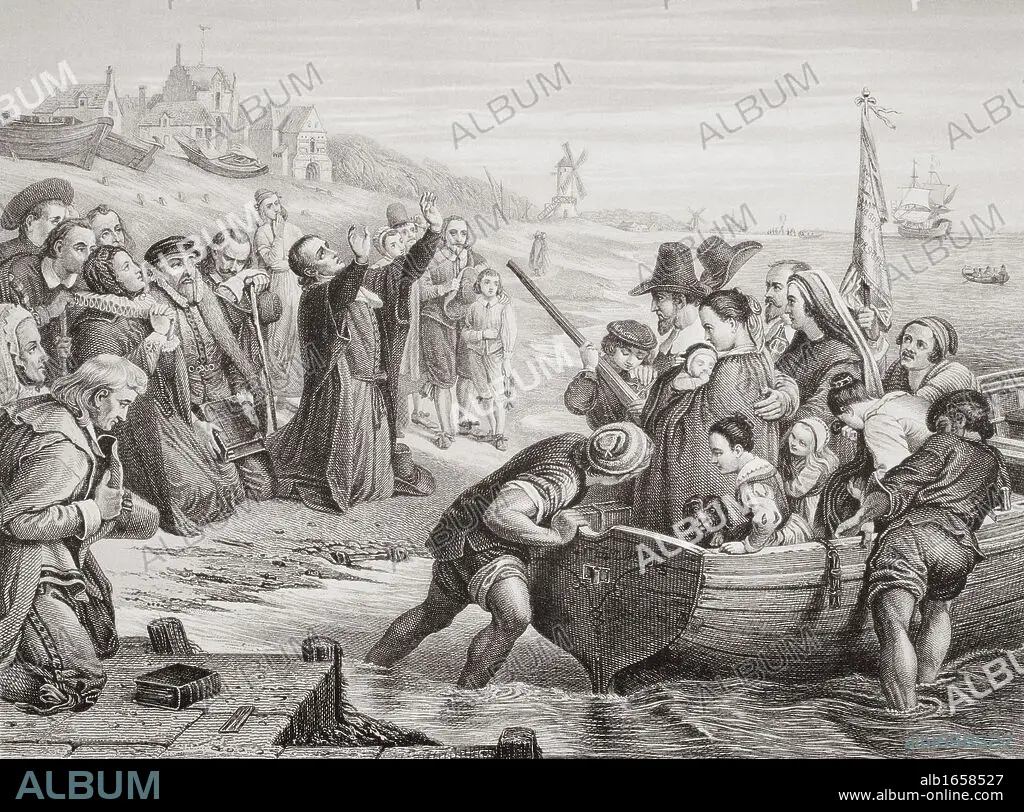 Caption: Departure of the Pilgrim Fathers from Delft Haven, July 1620. Engraved by T. Bauer after C.W. Cope. From the book 'Illustrations of English and Scottish History' Volume 1