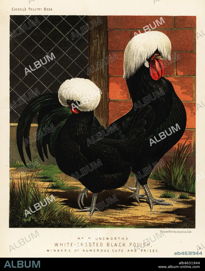 Caption: White-crested black Polish chickens, cock and hen, Gallus gallus domesticus. Bred by P. Unsworth and winners of numerous cups and prizes. Chromolithograph by Vincent Brooks Day & Son after an illustration by J.W. Ludlow from Lewis Wrights The Illustrated Book of Poultry, Cassell, London, 1890.