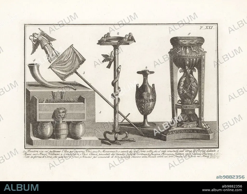 Caption: Terracotta showing the method of treading grapes for wine-making 1, Etruscan vase and candelabra with birds and snake 2, Roman military standard or signum from Trajan's Column 3, glass in the shape of a horn used by the Greeks and Romans 4, and tripod from the Vatican Museum 5. Copperplate engraving by Domenico Pronti from his own New Collection Representing Religious, Civil and Military Costumes of the Ancient Egyptians, Etruscans, Greeks and Romans, Nuova Raccolta Rappresentante I Costumi Religiosi Civili e Militari, Rome, 1805.