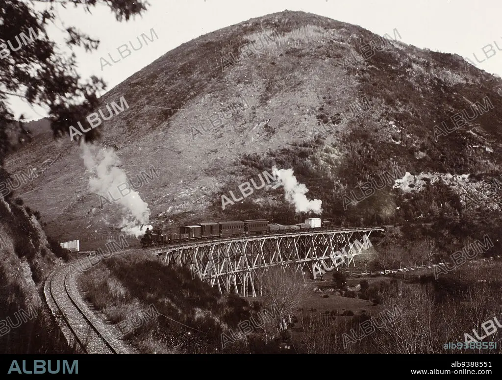 Rail bridge, South of Picton, Muir & Moodie studio, photography studio, circa 1900, Dunedin, photography, Depicts a steam train travelling over a wooden bridge in front of a large hill. G Class locomotives on each end of the train.