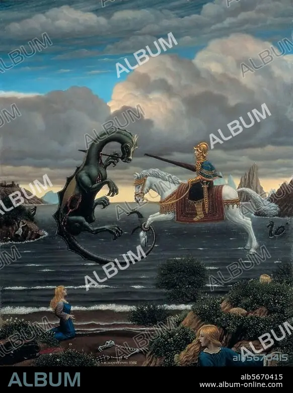 Caption: Mantovani, Adelchi-Riccardo born 1942 in Ro, since 1964 active in Berlin. "The world of St. George", 1986. Oil, 35 × 25cm. Private collection.