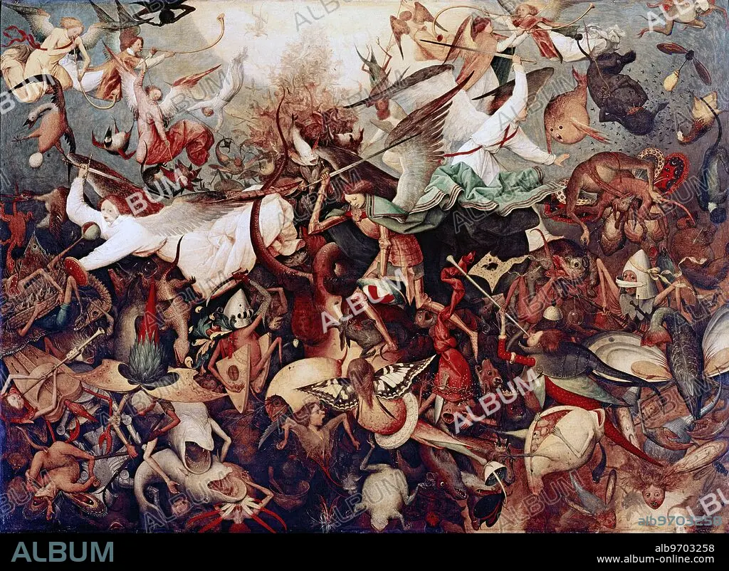 Caption: Fall of the Rebel Angels by Pieter Breugel (c.1525-69) - in the Royal Museum of Art, Brussels - Pieter Bruegel the Elder - The most famous member of the family and the only one to sign his paintings as 'Bruegel' without the H. - not Breughel - 1562. Oil on oak, 117 x 162 cm. Musées Royaux des Beaux-Arts, Brussels. Bruegel painted this picture when he was still living in Antwerp and supplying drawings to the engraver Hieronymus Cock. Turning his back on the then-dominant Italian models, he plunges into the then old-fashioned tradition of Hieronymus Bosch's world. An apparently inextricable mixture of persons and shapes offers itself to our bewildered gaze. Emerging from distant depths in a halo of light, monsters are thrown to earth as from a breaking wave. Angels combat them, led by St Michael, thin as a rake in his golden armour, striking with his sword at the dragon with the seven crowned heads on which he has his oothold. - ©:TopFoto