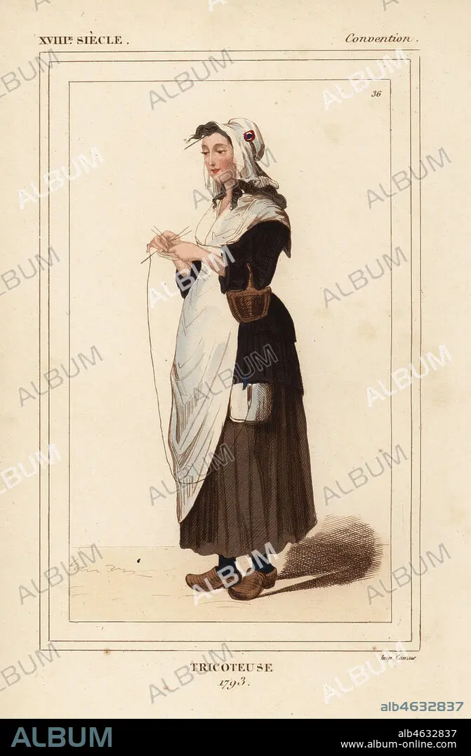 Caption: Tricoteuse, 1793, market women who knitted while attending public executions during the French revolution. Handcoloured lithograph from Le Bibliophile Jacob aka Paul Lacroix's Costumes Historiques de la France (Historical Costumes of France), Administration de Librairie, Paris, 1852.