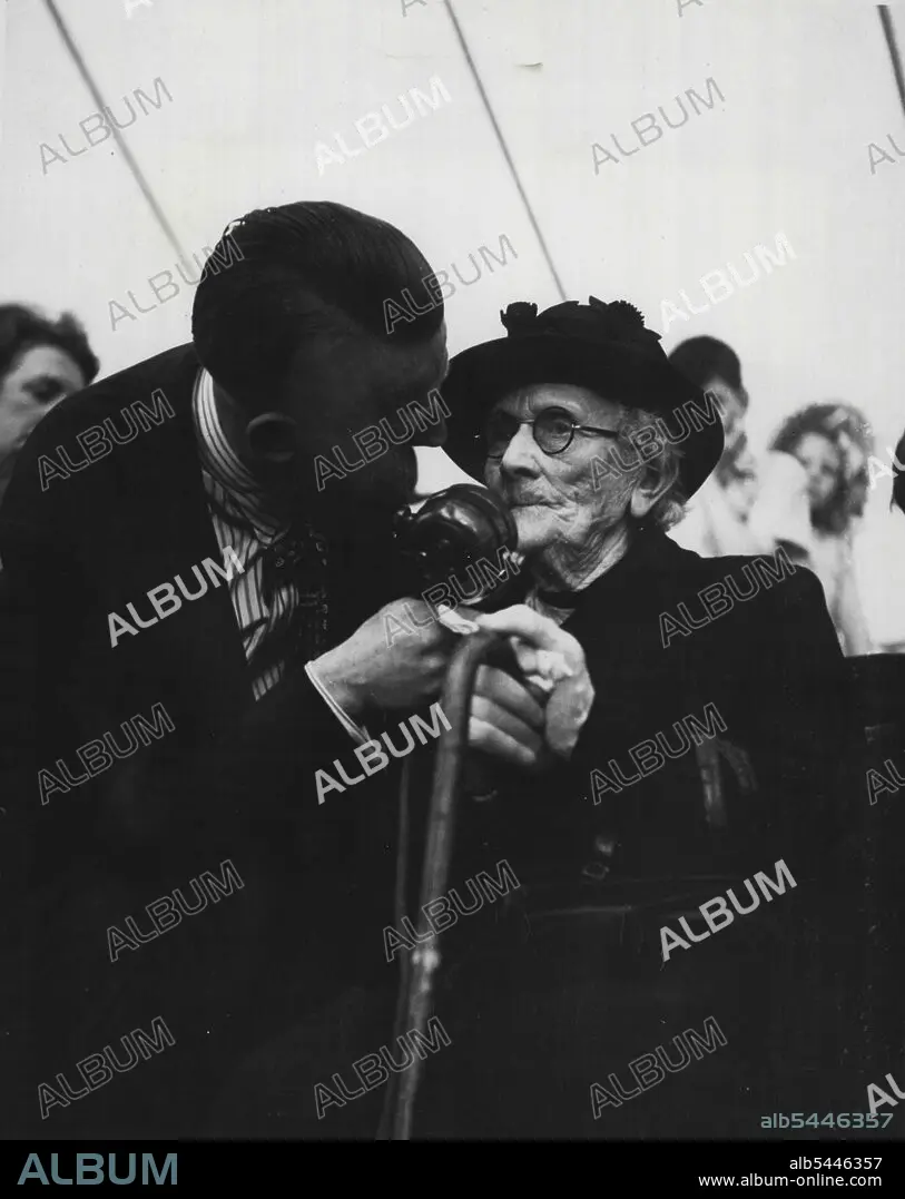 Caption: Pickles Party -- Mrs. Burgess tells the world she is "going 91", under Wilfred's persuasive influence. She has lived in St. Helens since she was 22, it comes out, and she has been going to bible class for fifty years, and enjoying the annual treats for as long. Wilfred hopes she'll enjoy many more. July 22, 1948. (Photo by Pictorial Press)