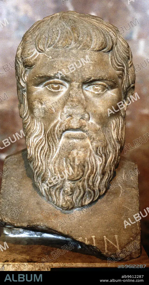 Caption: Plato, Ancient Greek philosopher. Plato (c428-c348 BC) was a student of Socrates and teacher of Aristotle. His most famous work is The Republic, in which he outlines his vision of an ideal state. Plato founded the Academy in Athens, one of the earliest known organised institutions of learning in Western civilization.