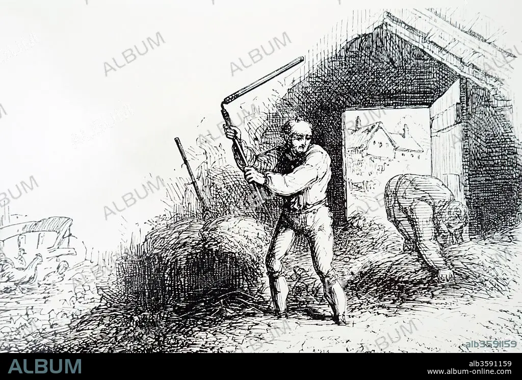 Caption: Engraving depicting the threshing of corn, on a threshing floor, using a hand flail. Dated 19th Century.