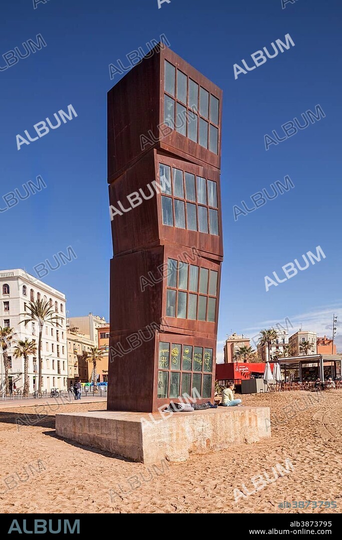 Caption: Estel Ferit sculpture by Rebecca Horn, on the beach at Barcelona, Catalonia, Spain, Europe