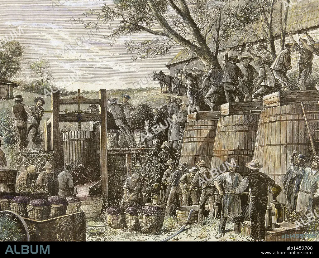 USA. California. 19th century. Chinese workers treading grapes. Engraving in "The Spanish and American Illustration".