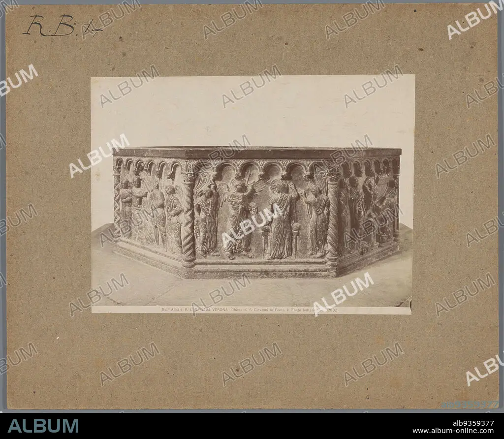 Detail of the pulpit of the Church of Saint Andrew at Pistoia by Giovanni Pisano, depicting the crucifixion of Christ, PISTOIA - Chiesa di S. Andrea. Dettaglio del pulpito, la Crocifissione. (Giovanni Pisano.) (title on object), Alinari (mentioned on object), Sint-Andreaskerk, 1875 - 1900, cardboard, albumen print, height 190 mm × width 244 mm