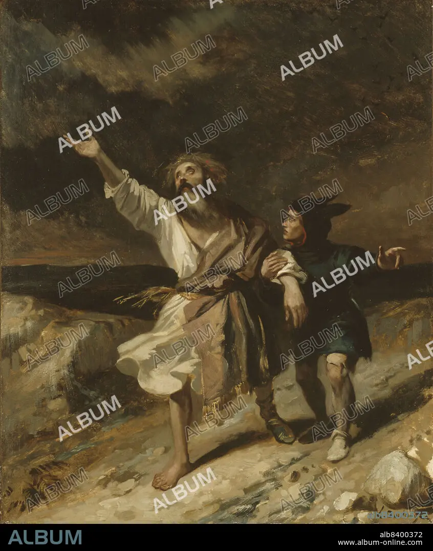 Caption: Le roi Lear et son fou pendant la tempête, 1836. King Lear and his fool during the storm. King Lear, scene 2 of act III, the king sinks into madness. The rocky landscape echoes his torment.