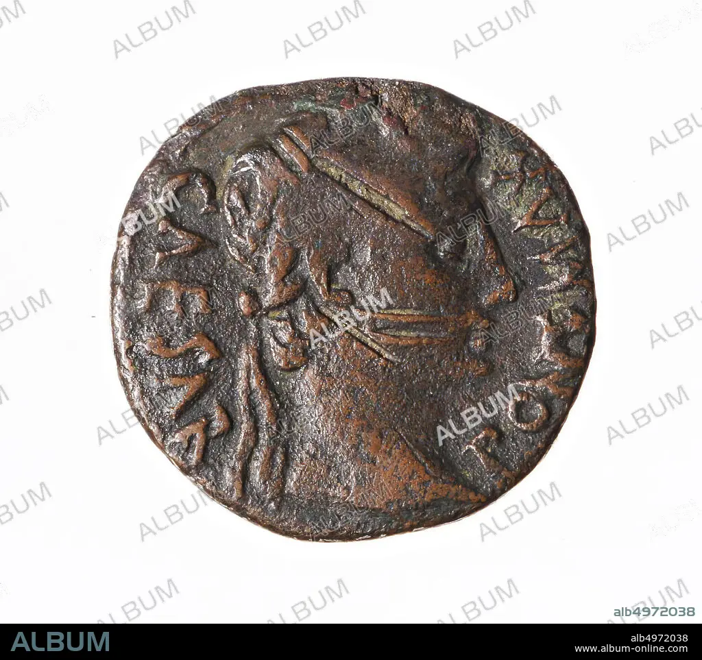 Caption: Vz: laurelled head n.r., CAESAR PONT MAX, Kz: altar of Lyon, ROM ET AUG, coin, axle, August, metal, copper, Diam. 26 mm, wt. 9.25 gr, Roman BC 8-3, the Netherlands, Gelderland, Nijmegen, Nijmegen