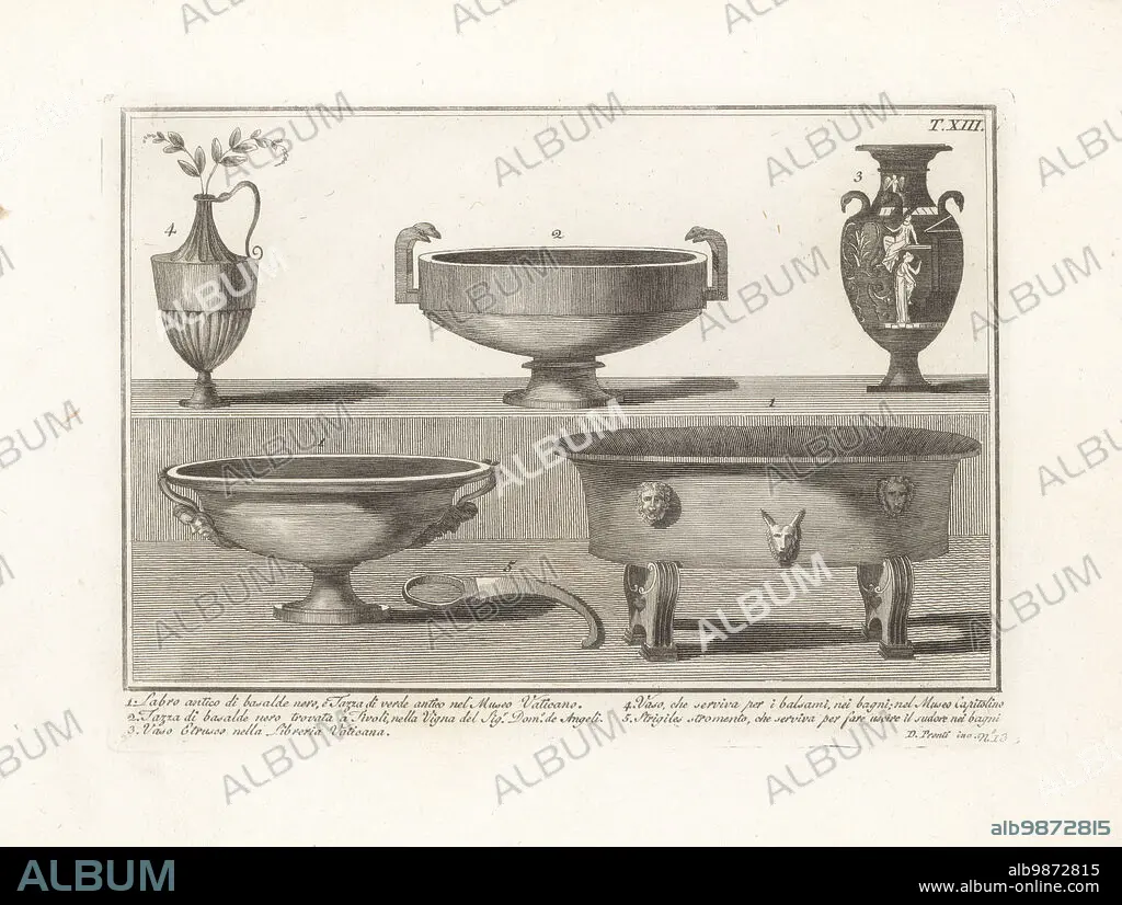 Black basalt bath tub or labrum in the Vatican Museum 1, black basalt plate found in Tivoli 2, Etruscan vase in the Vatican Library 3, bathing balm vase in the Capitoline Museum 4, and strigil used to scrape off sweat and oil 5. Copperplate engraving by Domenico Pronti from his own New Collection Representing Religious, Civil and Military Costumes of the Ancient Egyptians, Etruscans, Greeks and Romans, Nuova Raccolta Rappresentante I Costumi Religiosi Civili e Militari, Rome, 1805.