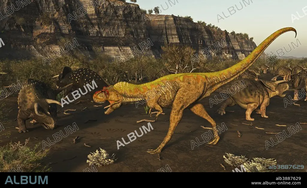 Title: A hungry Teratophoneus attacks a migrating herd of Nasutoceratops.