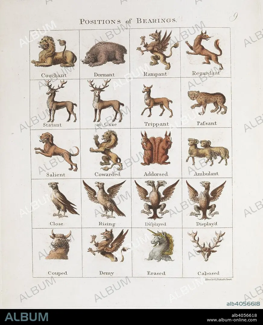 Caption: 'Positions of bearings'. Heraldic attitudes of beasts. British family antiquity : illustrative of the origin and progress of the rank, honours, and personal merit, of the nobility of the United Kingdom ; accompanied with an elegant set of chronological charts / By William Playfair ... London : Printed by T. Bensley, Bolt-Court. Published by T. Reynolds and W. Playfair., the proprietors, at n° 13, Thavies Inn, Holborn., 1809-1811. Source: 135.e.12 page 9.
