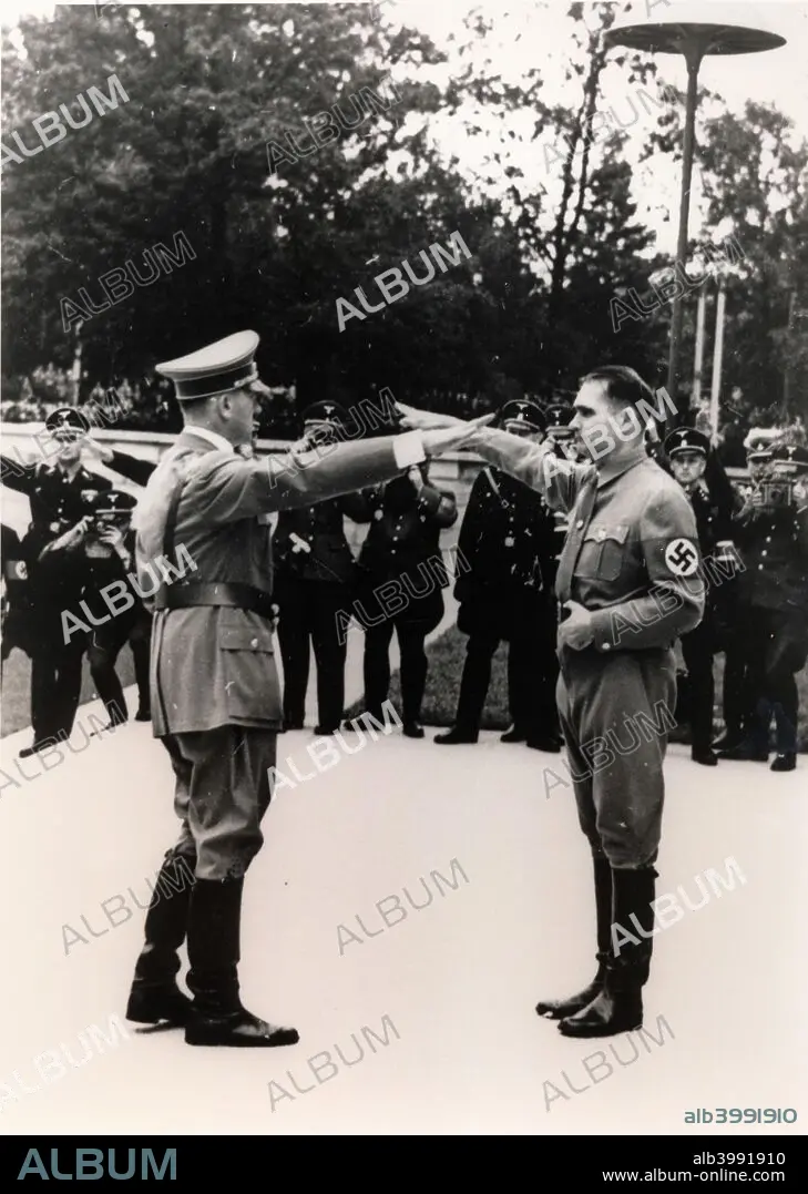 Nazi leaders Adolf Hitler and Rudolf Hess exchanging salutes, c1930s-c1940s. Hitler (1889-1945) appointed Hess (1894-1987) his deputy as leader of the Nazi Party in 1933, soon after the Nazis came to power. This effectively made Hess the third most powerful figure in Nazi Germany, after Hitler and Hermann Goering. In 1941, just before the German invasion of the Soviet Union, he flew to Scotland, ostensibly to begin peace negotiations with the British government. His plane crash landed near Eaglesham, Renfrewshire and he was arrested and spent the rest of the war as a POW. Found guilty of war crimes at the Nuremberg Trials in 1946, Hess spent the rest of his life in Spandau Prison in Berlin.