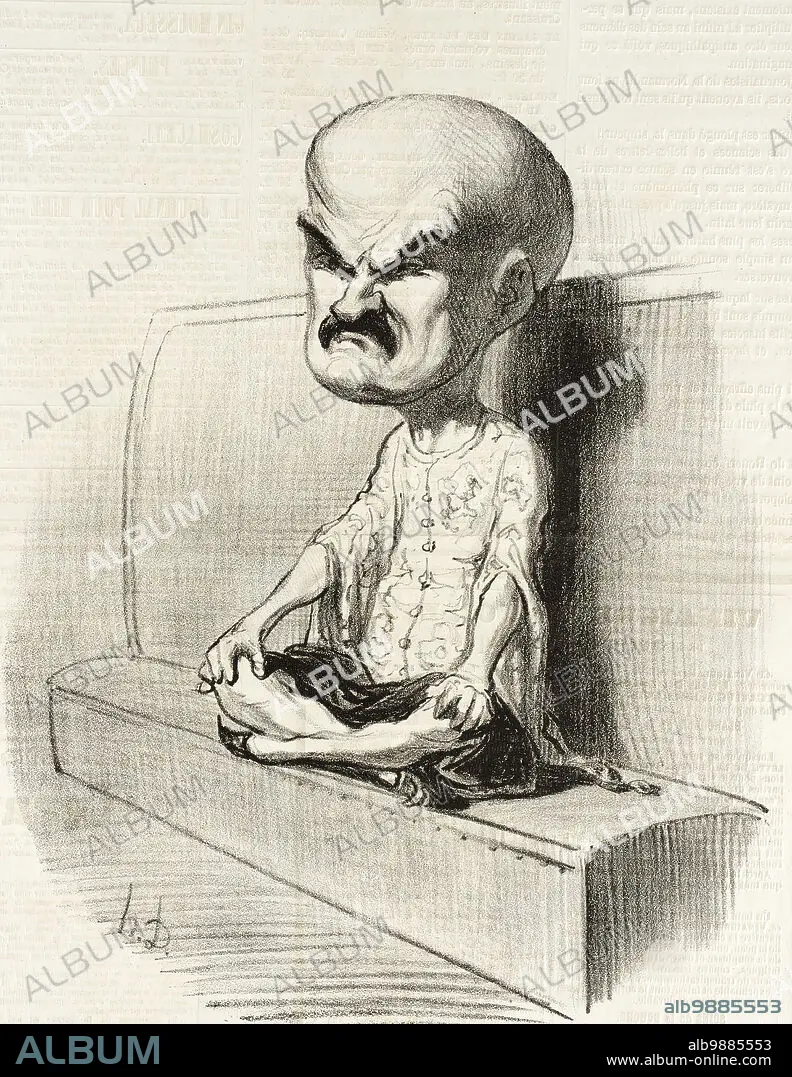 Caption: Vesin, 1849. French politician caricatured as 'Vézin de Macao' due to his bald head and incomprehensible speeches. From Les Représentans Représentés (Representatives Represented).