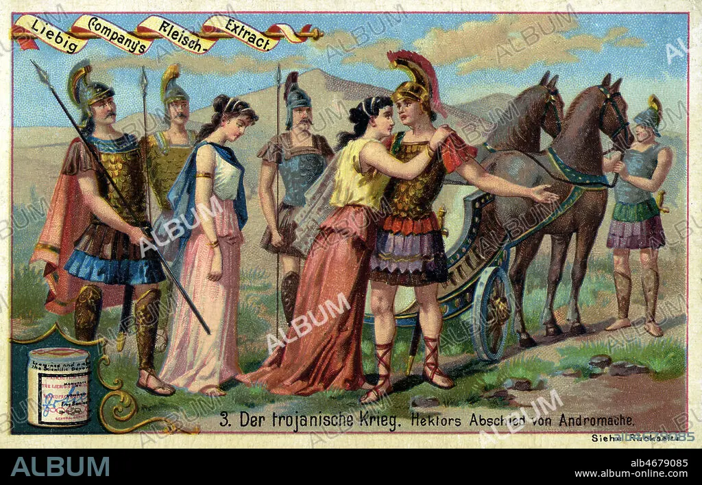 'Les adieux d'Hector a Andromaque'. Chromo Liebig allemand de 1893 sur la Guerre de Troie. Credit : Collection KHARBINE-TAPABOR.