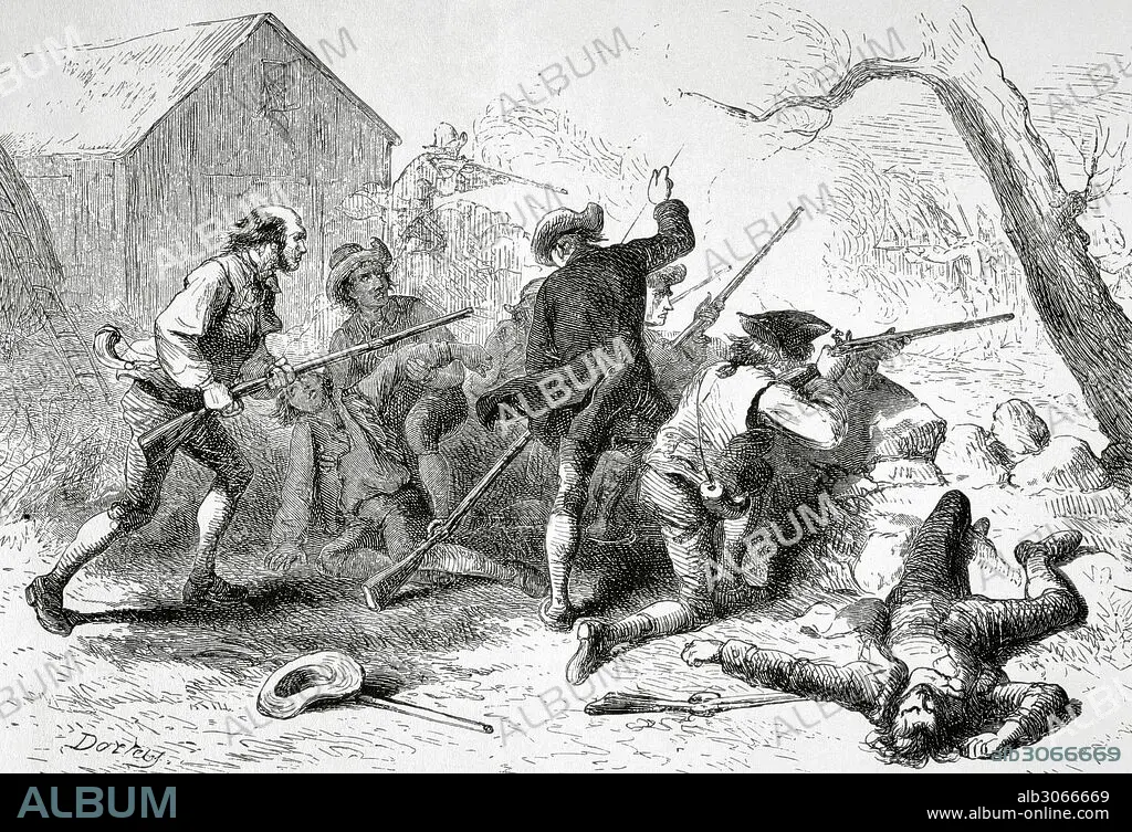 Caption: American Revolutionary War (1775-1783). Battles of Lexington and Concord. April 19, 1775. Engraving by Darley. The American Revolution, 19th century.