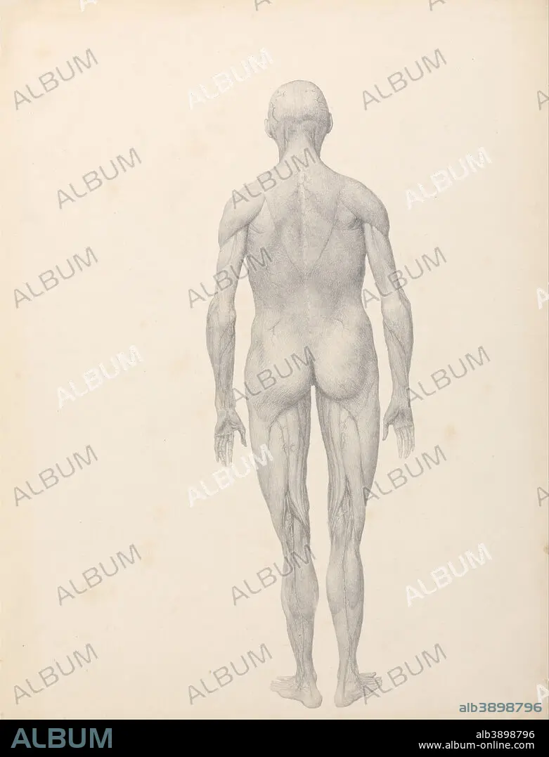 Caption: A Comparative Anatomical Exposition of the Structure of the Human Body with that of a Tiger and a Common Fowl: Human Figure, Posterior View, Partially Dissected (Finished Study for Table XII). Date/Period: 1795 to 1806. Drawing. Graphite on moderately thick, slightly textured, cream wove paper lined with Japanese paper. Height: 533 mm (20.98 in); Width: 403 mm (15.86 in).