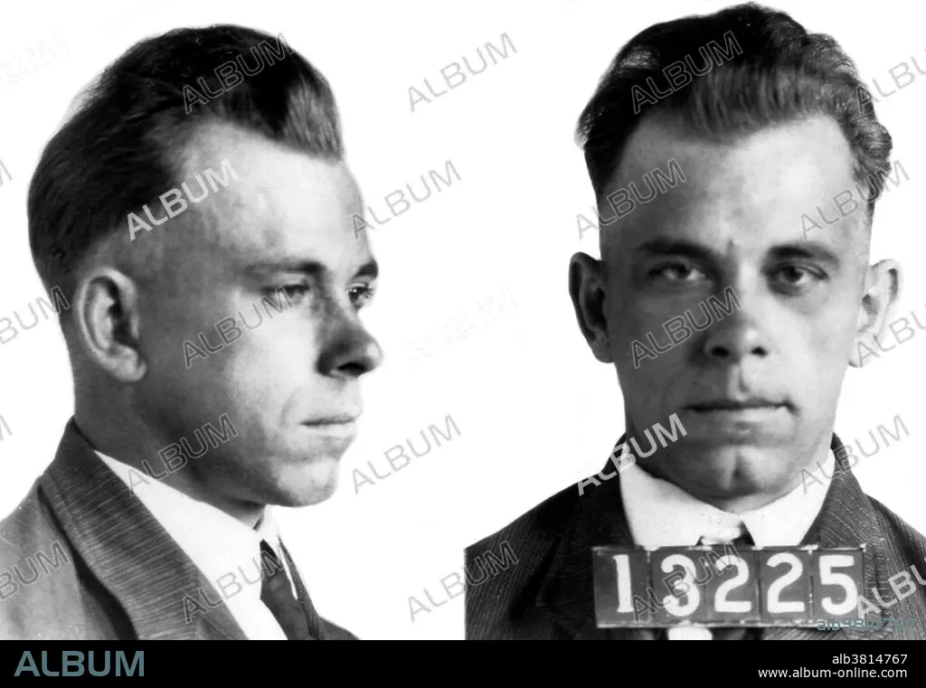 Caption: John Herbert Dillinger (June 22, 1903 - July 22, 1934) was an American gangster in the Depression-era United States accused of robbing 24 banks and four police stations. In the heyday of the Depression-era outlaw Dillinger was the most notorious of all. He courted publicity, styling himself as a Robin Hood figure, and the media of his time ran accounts of his bravado and colorful personality. In response, the Director of the Bureau of Investigation, J. Edgar Hoover, developed a more sophisticated Federal Bureau of Investigation as a weapon against organized crime. After evading police in four states for almost a year, Dillinger was wounded and returned to his father's home to recover. On July 22, 1934 the police and Division of Investigation closed in on the Biograph Theater. Federal agents, led by Melvin Purvis and Samuel P. Cowley, moved to arrest Dillinger as he exited the theater. He pulled a weapon and attempted to flee but was shot four times and killed. He was 31 years old.