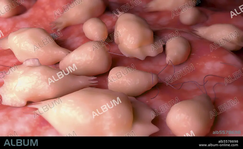Caption: Conceptual biomedical illustration of primary amoebic meningoencephalitis, also known as Naegleriasis, on the surface of human brain.