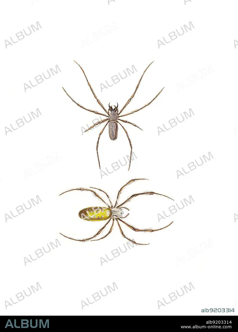 Caption: Golden silk spider (Nephila clavipes), as illustrated by Carl Wilhelm Hahn in his Monographia Aranearum, also known as Monographie der Spinnen, in the 1820s. The spider on top is male, and the yellow one on the bottom is female. These spiders are not to scale; female golden silk spiders are much larger than the males.