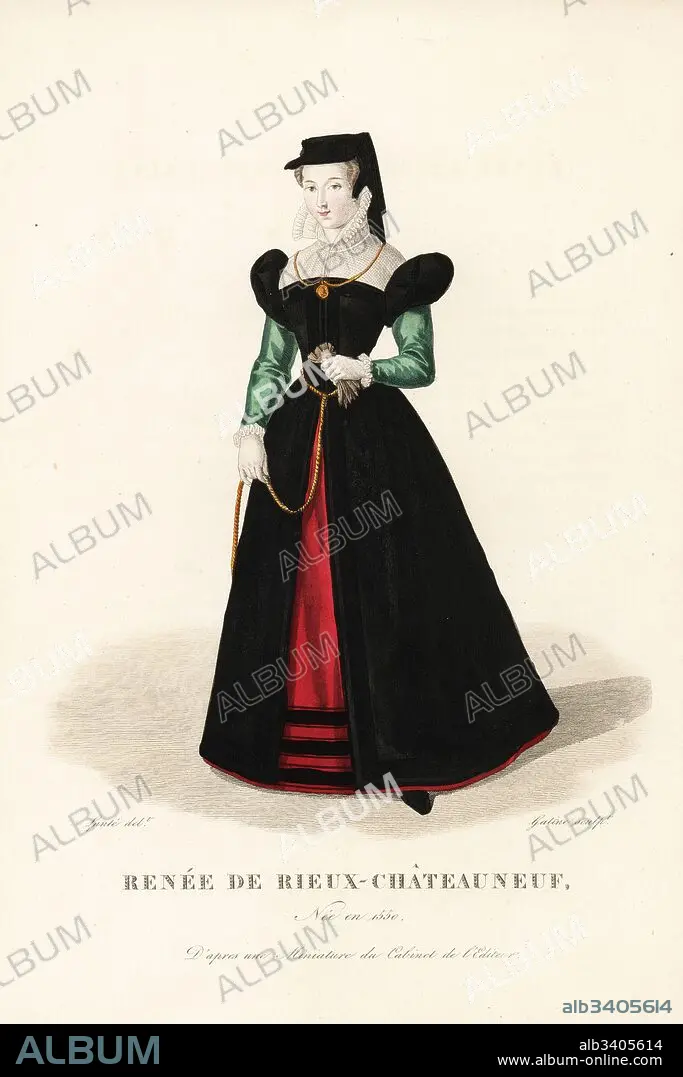 Renee de Rieux-Chateauneuf, La Belle Chateauneuf, mistress of King Henry III, 1550-158?. She wears a chaperon with peak, black velvet dress with shoulderpads, lace ruff collar, green sleeves, scarlet petticoat and gold rope belt. After a miniature in the editor's collection. Handcoloured copperplate engraving by Georges Jacques Gatine after an illustration by Louis Marie Lante from Galerie Francaise de Femmes Celebres, Paris, 1827.