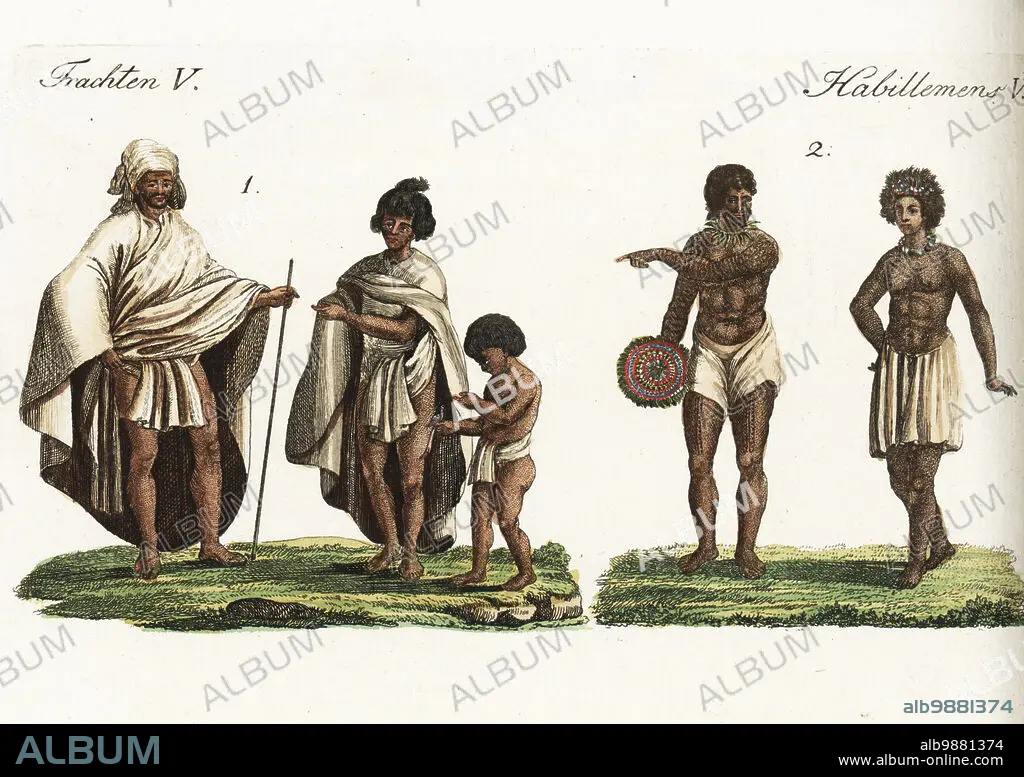 Caption: Costumes of the people of the Pacific, 18th century. Polynesian man and woman of Tahiti wearing tapa bark-fabric tiputa cloaks 1, Hawaiian man and woman in tapa bark-fabric skirts, the man a dancer with an 'uli'uli feather rattle 2. Handcoloured copperplate engraving from Friedrich Johann Bertuch's Bilderbuch fur Kinder (Picture Book for Children), Weimar, 1792.