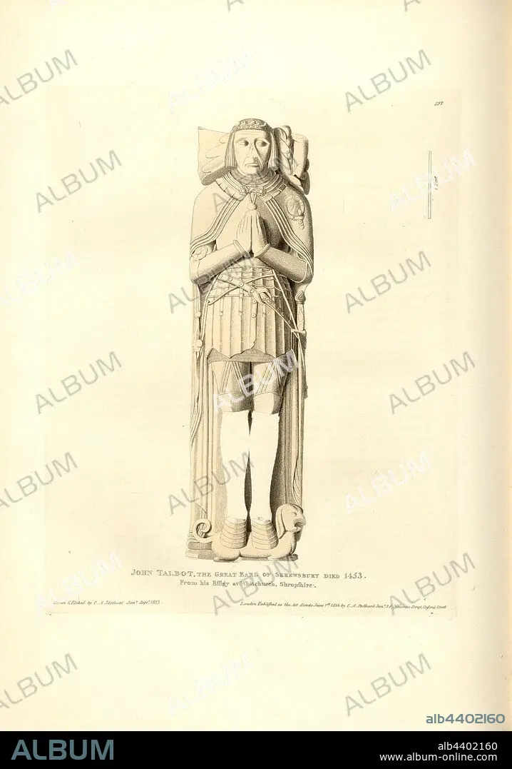 Caption: John Talbot, the great Earl of Shrewsbury Died 1453. From his Effigy at Whitchurch, Shropshire, Tomb of John Talbot, 1st Earl of Shrewsbury, at St Alkmund's Church in Whitchurch, signed: Drawn & Etched by C.A. Stothard Jun, Published by C.A. Stothard Jun, Fig. 139, 127, after p. 93, Stothard, Charles Alfred Jun. (drawn, etched and publ.), Charles Alfred Stothard, Alfred John Kempe: The monumental effigies of Great Britain: selected from our cathedrals and churches, for the purpose of bringing together, and preserving correct representations of the best historical illustrations extant, from the Norman conquest to the reign of Henry the Eighth: dedicated by permission to the Prince Regent. London: printed by J. M'Creery [...], 1817-1832