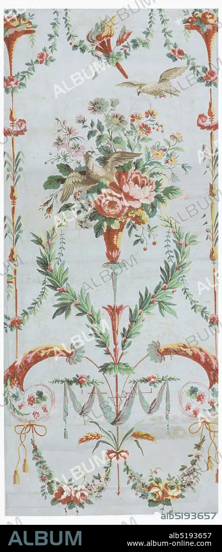 Caption: Les Deux Pigeons, Jean-Baptiste Réveillon, French, 17251811, Block printed on handmade paper, Vertical rectangle of joined sheets of paper. Large basket of flowers with dove flying out from its midst; another dove above, to right. Along each margin, slender shaft with occasional foliation, intercepted by small urn of flowers. Scrolls and swags of foliage and drapery, and crossed arrow and torch above large basket; diagonal yellow dotting on field., Paris, France, 1789, Wallcoverings, Sidewall, Sidewall