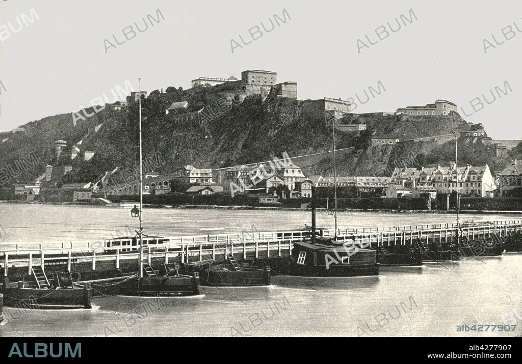 The Fortress of Ehrenbreitstein on the Rhine, Germany, 1895. Ehrenbreitstein Fortress, built in the 19th century, with pontoon bridge in the foreground. From "Round the World in Pictures and Photographs: From London Bridge to Charing Cross via Yokohama and Chicago". [George Newnes Ltd, London, 1895]