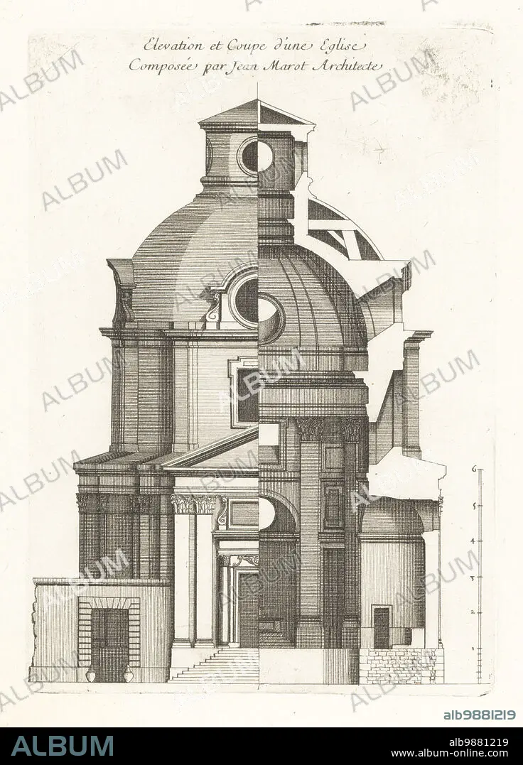 Caption: Elevation and section of a church designed by architect Jean Marot. Elevation et Coupe d'une Eglise composee par Jean Marot Architecte. Copperplate engraving drawn and engraved by Jean Marot from his Recueil des Plans, Profils et Elevations de Plusieurs Palais, Chasteaux, Eglises, Sepultures, Grotes et Hotels, Collection of Plans, Profiles and Elevations of Palaces, Castles, Churches, Tombs, Grottos and Hotels, chez Mariette, Paris, 1655.
