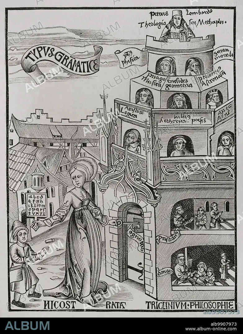 Caption: Allegorical composition depicting the different degrees of university teaching. Allegory of the ascent to the spheres of knowledge. Facsimile illustration of a wood engraving from the "Margarita Philosophica", by Gregor Reisch, published in 1503. Sciences & Lettres au Moyen Age et à l'époque de la Renaissance. Paris, 1877.