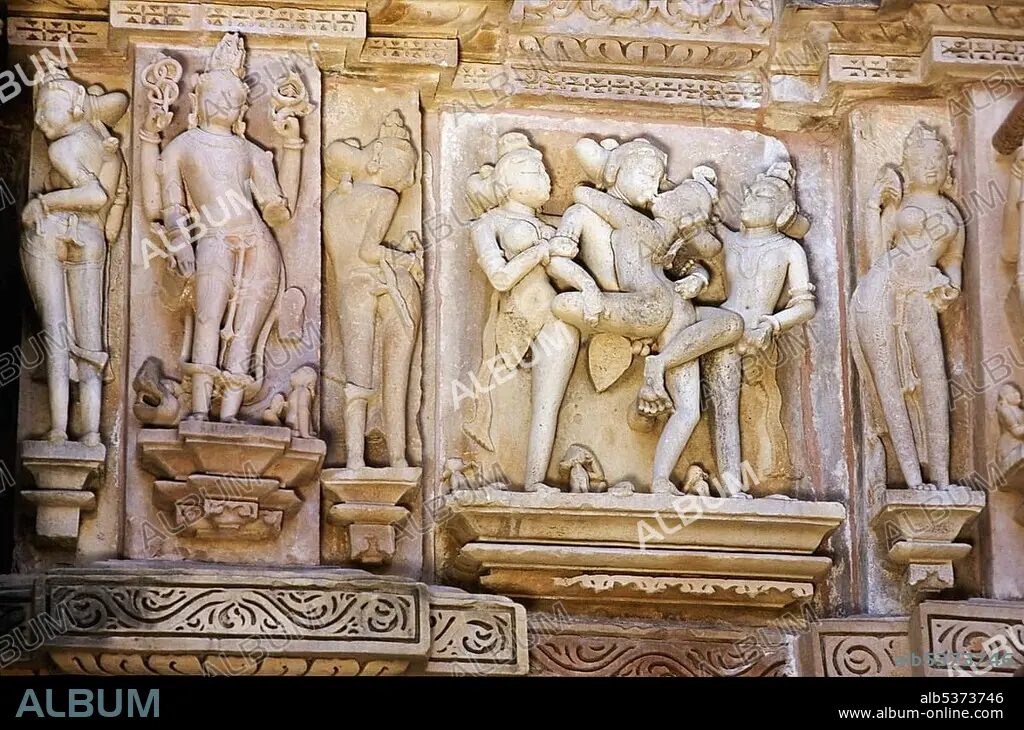 Stone carvings depicting scenes from the Kamasutra, Khajuraho temples, Khajuraho, Madhya Pradesh, India, Asia