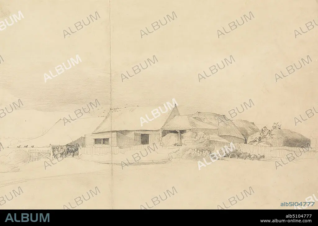Caption: Farm Buildings with Stack Makers, Cornelius Varley, 17811873, British, ca. 1810, Graphite on medium, cream, slightly-textured wove paper, Sheet: 8 1/4 x 12 1/2 inches (21 x 31.8 cm), architectural subject, birds, bushes, carts, chickens, farmers, genre subject, hay, horses (animals), laborers, landscape