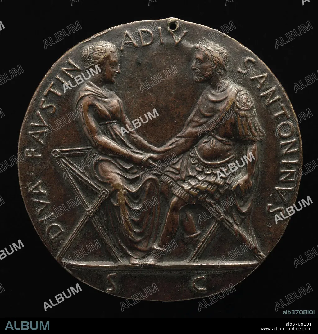 Caption: Antonius Pius and Faustina Joining Hands [reverse]. Dated: fourth quarter 15th century. Dimensions: overall (diameter): 10.13 cm (4 in.) gross weight: 521.1 gr (1.149 lb.) axis: 12:00. Medium: bronze.