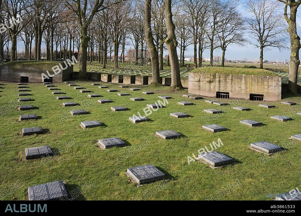 German military cemetery Langemark, gravestones and bunkers, First World War, Langemark Poelkapelle, West Flanders, Flanders, Belgium, Europe.