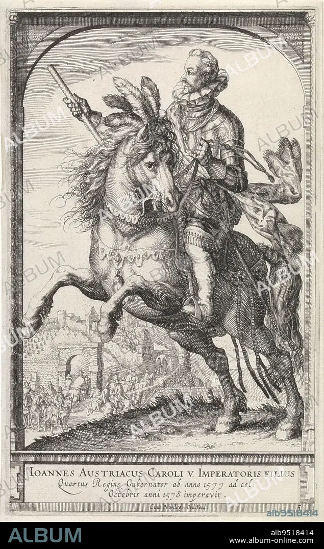 Caption: Don Juan of Austria, governor of the Netherlands, on horseback. To the left. He has a staff in his hand. In the background the conquest of the citadel of Namur. The print has a Latin caption and is part of a series of equestrian portraits of Dutch governors, Equestrian portrait of Don Juan of Austria Ioannes Austriacus Caroli V imperatoris Filius, Governors of the Netherlands (title series)., print maker: Hessel Gerritsz, (attributed to), print maker: Christoffel van Sichem (II), (rejected attribution), publisher: Willem Janszoon Blaeu, (possibly), Amsterdam, 1591 - 1632, paper, etching, w 157 mm × h 254 mm