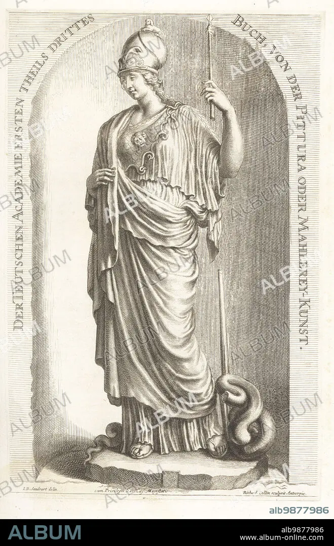 Caption: Minerva Giustiniani or Athena Giustiniani, in Corinthinian helmet, chiton and himation, with aegis and gornoneion on her breast, holding a spear. Roman marble statue of Pallas Athena, based on an ancient Greek bronze sculpture. In the Galleria Giustiniana, now in the Vatican. Copperplate engraving by Richard Collin after an illustration by Joachim von Sandrart from his LAcademia Todesca, della Architectura, Scultura & Pittura, oder Teutsche Academie, der Edlen Bau- Bild- und Mahlerey-Kunste, German Academy of Architecture, Sculpture and Painting, Jacob von Sandrart, Nuremberg, 1675.