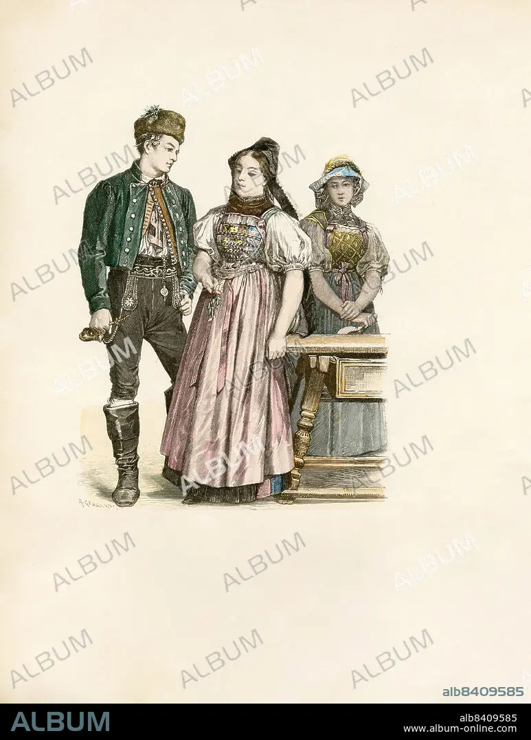 Caption: German Folk Dress (former Grand-duchy of Baden), Western Baar, Catholic Baar, late 19th Century, Illustration, The History of Costume, Braun & Schneider, Munich, Germany, 1861-1880