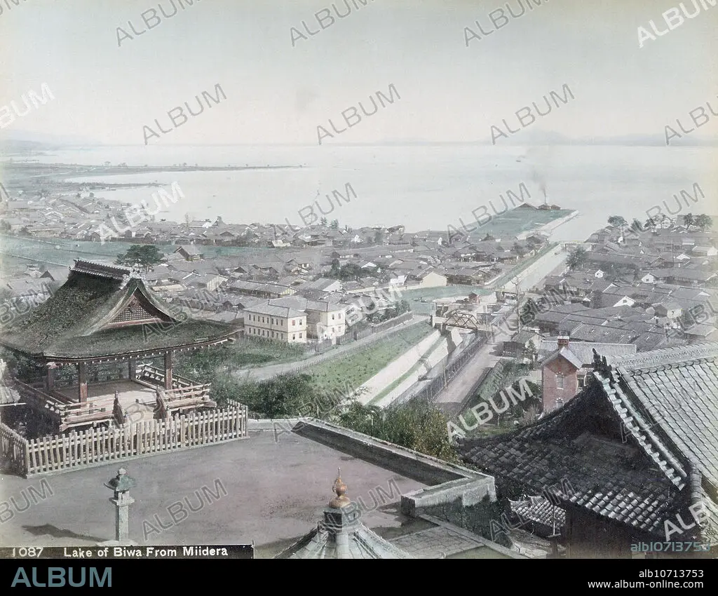Caption: [ 1890s Japan - Otsu and Lake Biwa as Seen from Miidera Temple ] Otsu City and Lake Biwa in Shiga Prefecture as seen from Miidera (), a Buddhist temple also known as Enjoji (). The canal is the Lake Biwa Waterway (, Biwako Sosui) designed by Sakuro Tanabe to generate electricity and supply drinking water for Kyoto City, as well as facilitate transportation. This photo is believed to have been taken shortly after the opening of the canal in 1890 (Meiji 23). 19th century vintage albumen photograph.