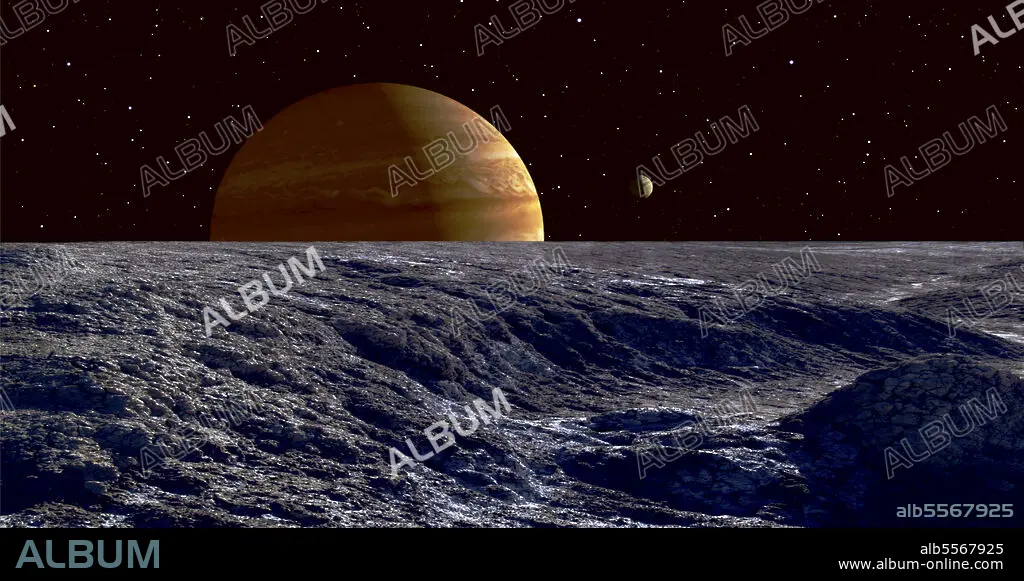 Title: The gas giant Jupiter seen above the surface of Jupiter's moon Europa.
