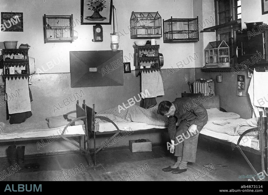 Caption: GERMANY around 1930. Orig. caption ... MODERN PENALTY IN GERMANY. Stage II living and sleeping area, which hardly feels like a prison cell. The prisoner is allowed here to keep birds and flowers and also make other comforts. Photo: AB Text & Bilder / SVT / Code: 5600 Folder: German prisons (men) 2460 B Photo series Photo report Bird cages Pets sites: GERMANY PhotoDate: 193? - ?? - ??