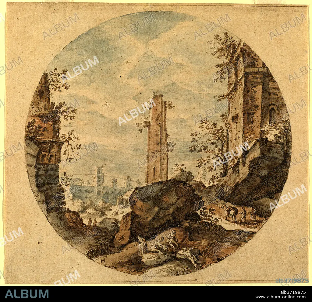 PIETER STEVENS. Travellers among Roman Ruins. Dimensions: sheet: 21.1 x 23.6 cm (8 5/16 x 9 5/16 in.) image (diameter): 19.8 cm (7 13/16 in.). Medium: pen and brown ink with red-brown and blue wash, incised for transfer.